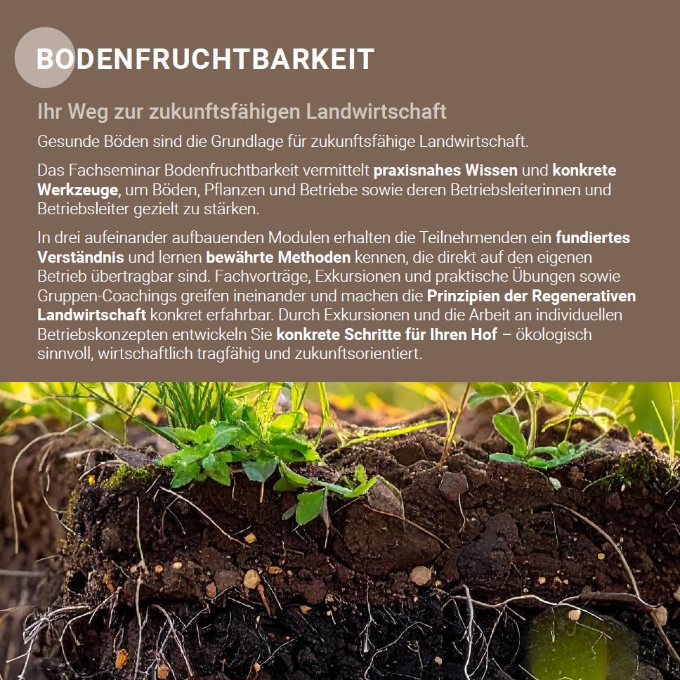 Gesunde Böden sind die Grundlage für eine zukunftsfähige Landwirtschaft. Das Fachseminar Bodenfruchtbarkeit bietet Landwirtinnen und Landwirten sowie Beraterinnen und Beratern die Möglichkeit, Boden, Pflanze, Tier und Betrieb wieder in Einklang zu bringen.