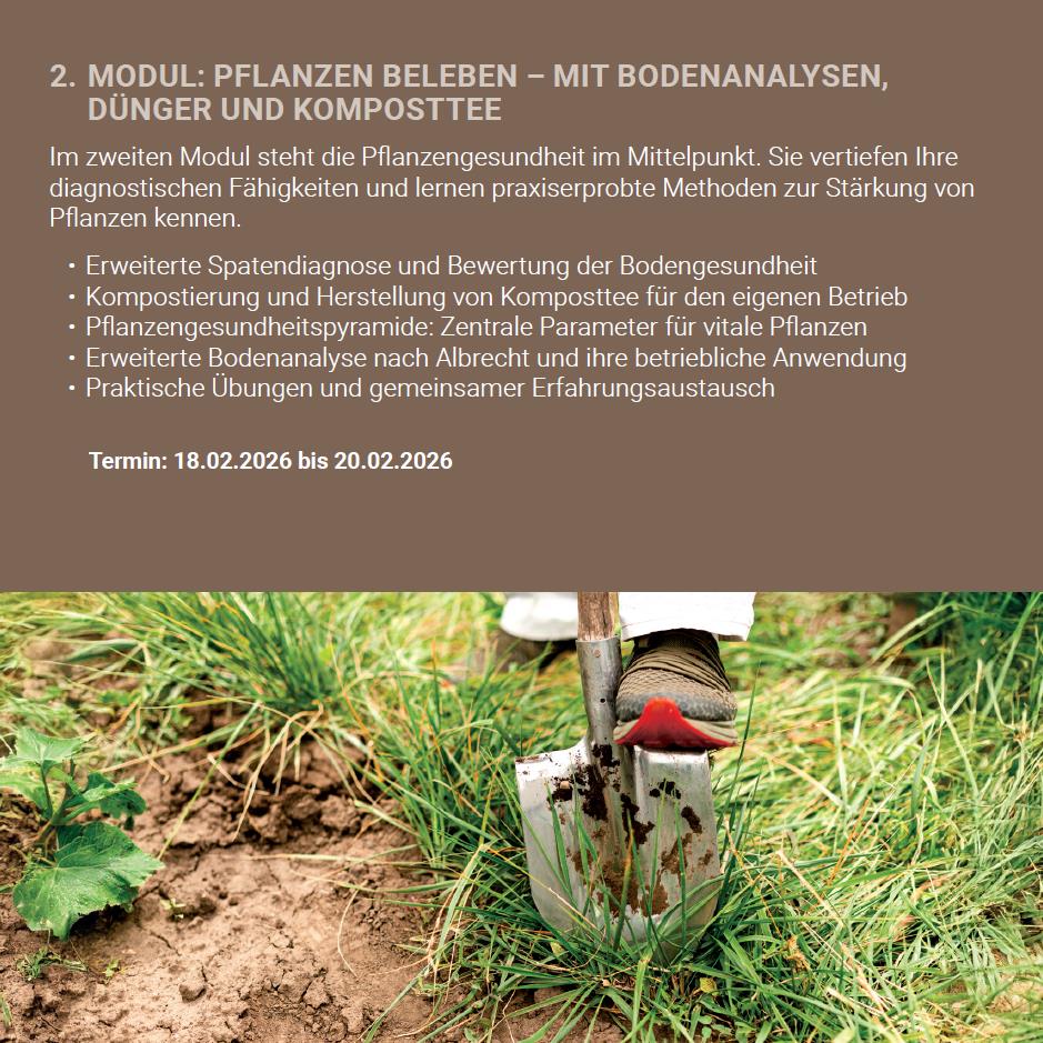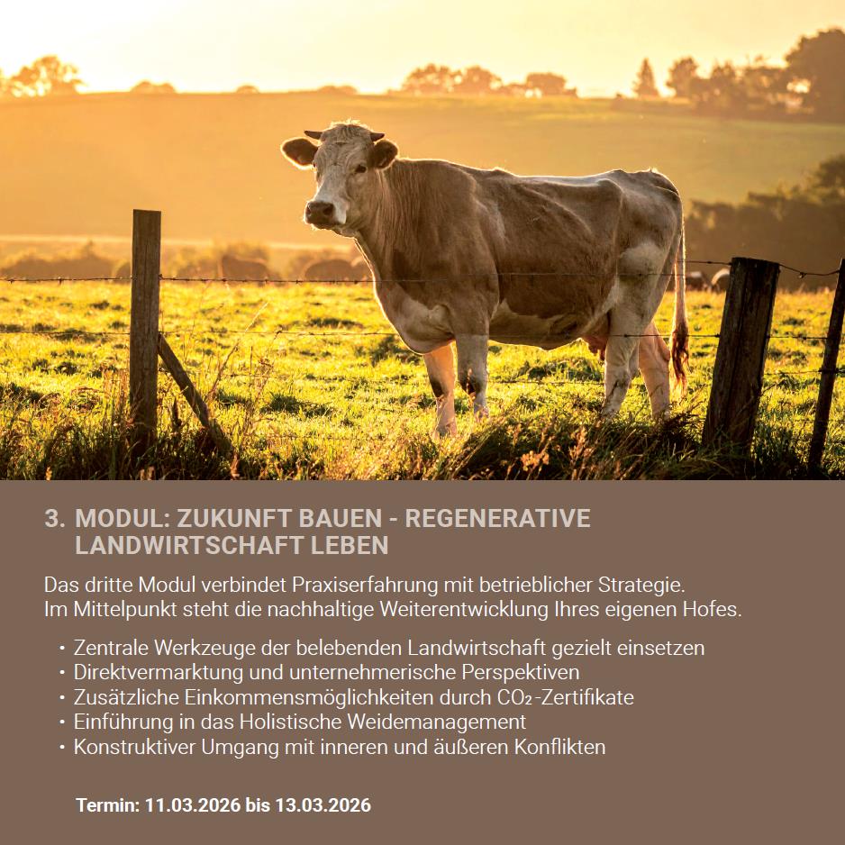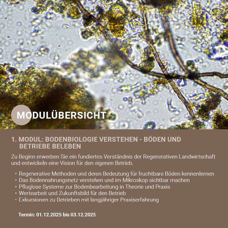Im ersten Modul stehen Bodenbiologie und bodenschonende Bewirtschaftung im Mittelpunkt. Neben den Grundlagen der regenerativen Landwirtschaft lernen die Teilnehmenden das Bodennahrungsnetz kennen und erfahren, wie sich pfluglose Systeme in den Betrieb integrieren lassen. Das zweite Modul widmet sich der Pflanzengesundheit, der Kompostierung und der Bodenanalyse mit der Albrecht-Methode. Im abschließenden Modul liegt der Fokus auf der ganzheitlichen Betriebsentwicklung, Holistischem Weidemanagement und der strategischen Vermarktung der Qualitätssteigerung. Exkursionen zu Praxisbetrieben runden das Programm ab und zeigen, wie sich regenerative Methoden erfolgreich umsetzen lassen. Das Fachseminar bietet Ihnen die Möglichkeit, in einer unterstützenden Gruppe zu lernen, sich gemeinsam auszutauschen und Entwicklungen zu diskutieren.